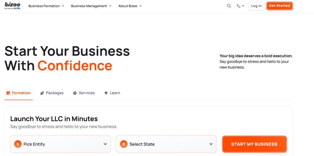 Bizee provides a streamlined LLC formation process with a $0 service fee starting point. The company offers various business formation services with transparent pricing and no hidden fees. Each formation package includes a full year of registered agent service, ensuring immediate state compliance.